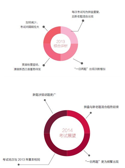 正如我之前提到的,2013 年均为拼盘重复,新老题混合考;2014 年将会延续该趋势。不但如此,拼盘的规律将更难把握,重复的范围将不仅限于北美老题,也可能出现一些无规律的重复,增加托福考试预测的难度。