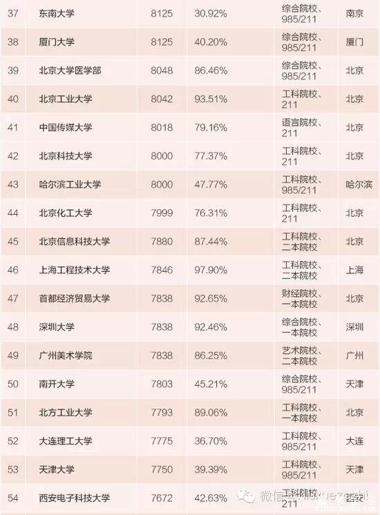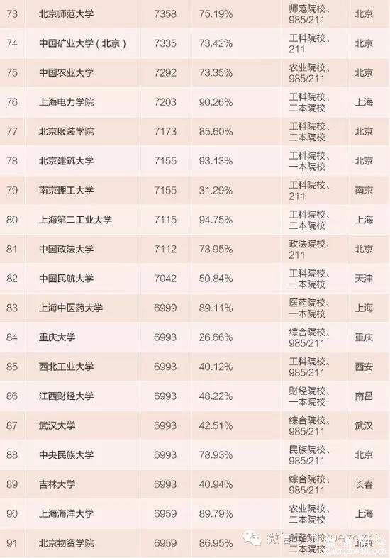 榜单的数据来自全国2528所高校的1173万个毕业生样本。共100所大学上榜,其中, 68所大学位于北上广深等一线城市,其中北京高校有40所、上海21所、广州6所、深圳1所 百强大学中毕业生就业地基本都在北上广深,只有29所大学的一线城市就业率低于50%。 1 要想毕业薪酬高,依然要读名校和重点大学