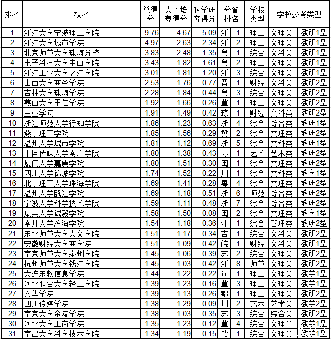 在经济学、法学、教育学、文学、历史学、管理学、艺术学7个学科门类组合的社会科学排名中,浙江大学宁波理工学院列第1名,北京师范大学珠海分校第2名,电子科技大学中山学院第3名。