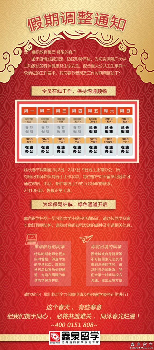 致鑫泉集团尊敬的客户:鉴于疫情发展迅速,为切实保障广大学生和家长的身体健康即生命安全。配合重大公共卫生事件一级响应的工作要求,我司春节假期即工作时间调整。