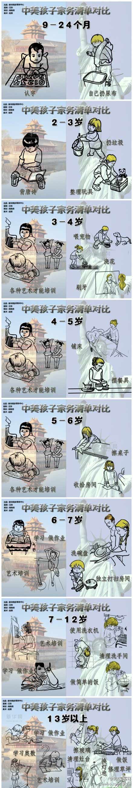 2岁前,中国孩子在干啥?认字。美国孩子呢?学会扔尿布。3岁呢?中国孩子已能琅琅背诵“床前明月光”等好多首唐诗,美国孩子学着扔垃圾、整理玩具。不能不感叹中国孩子多才多艺,因为人家从四五岁开始就一边学习,一边忙着弹钢琴、学跳舞,一直到上中学。“学习就是孩子的家务”在漫画中展现得淋漓尽致。