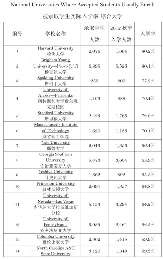 《美国新闻与世界报道》发布美国大学2013年秋季入学实际入学率排行榜,以下是鑫泉美国留学小编为大家整理的“综合型大学入学率前50名”排名,供各位参考。