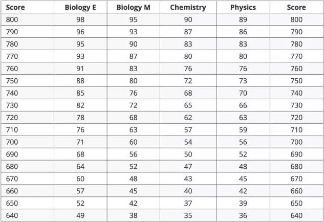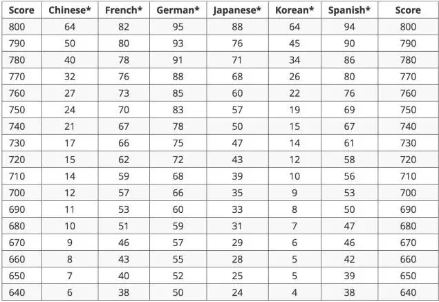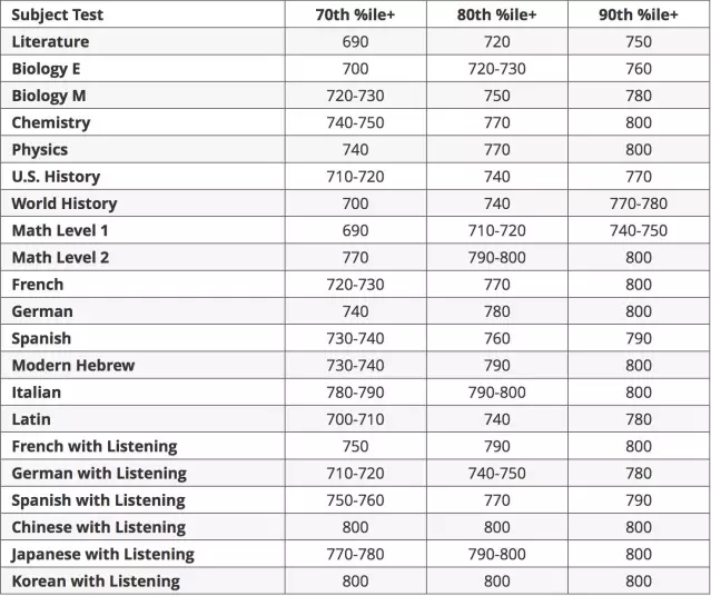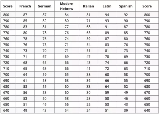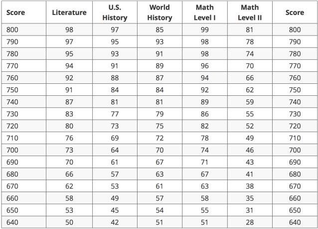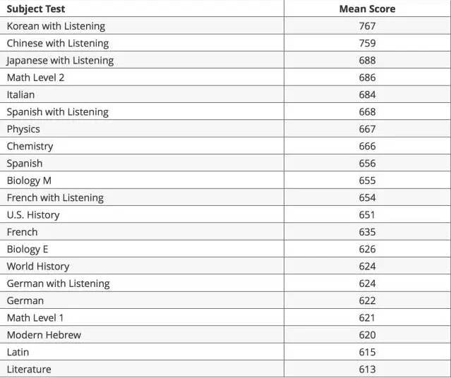根据下图我们大概可以推测出一个好的成绩都是在700以上,通过下面的表格中的数据,我们可以了解每门SAT2相对应的高分。