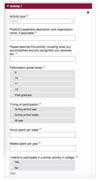 在我看来,这个活动可信度很小很小,因为要知道国内的高中还没有那么多时间可以让学生一周拿出12个小时去做志愿者活动,很多学校无论是高考班还是国际部都是以升学为导向的,一切浪费时间影响升学的准备都是耍流氓,所以根本不会有那么多时间可以允许申请者去做志愿者活动。当然,也有个例,就是一年之中一个月集中做志愿者或者是某一项活动,那有可能达到更多的时间,比如summer school,科学实验,暑期游学项目等等。因此,合理安排和梳理活动时间也是申请的细节关键。通常,活动时间和内容的体现是通过网申系统activity 部分体现的,如下图所示: