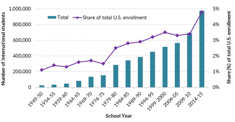 根据国际教育协会(IIE)发布的《2017年门户开放报告》,2016-17学年,中国大陆赴美留学人数达到了350,755,比上一年增加了足足6.8%。中国赴美留学人数在所有留美生源国中连续第八年位居榜首,占在美国际学生总数的32.5%。