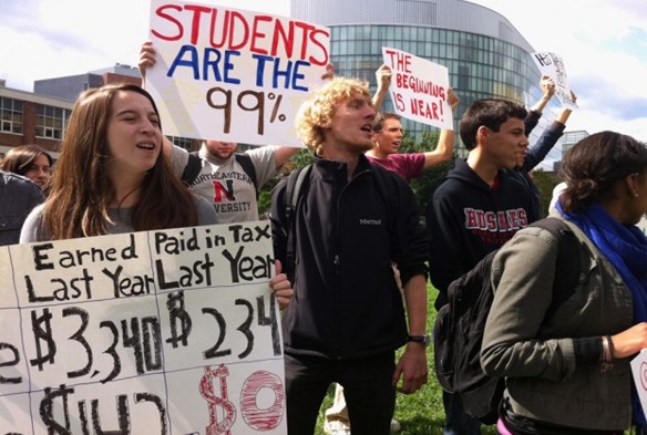一名年轻人举起标语:“监禁学生贷款协会Sallie Mae,取消所有学生贷款债务。”他站在曼哈顿下城自由广场,参与“占领华尔街”的抗议活动。