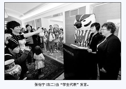 张怡宁美国留学晚宴秀英语 黑色西装显干练(图