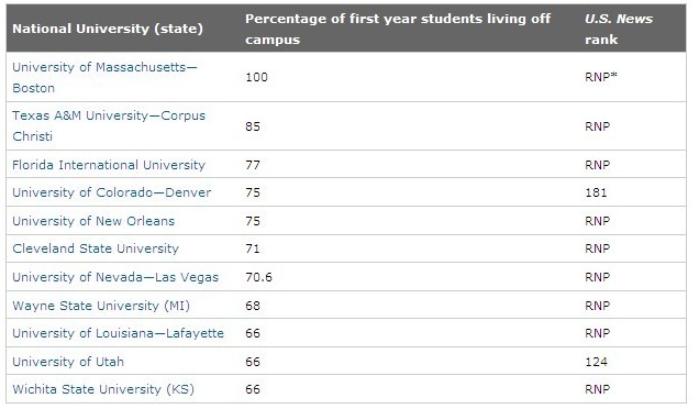 根据国家大学所提供的数据表明,平均只有21.3%的新生选择住在校外。有101所学校对外宣称有10%或更少的大学新生选择了校外住宿,其中65所学校显示,有5%或更少的新生选择住在校外这一选项。其中有十二所大学以及一些大学机构如普林斯顿大学、斯坦福大学以及耶鲁大学显示没有新生住在校外。