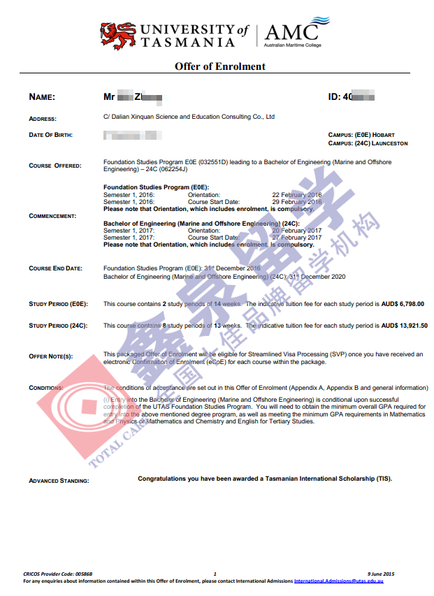 塔斯马尼亚大学航海工程预科+本科申请要求:M同学毕业于大连红旗高中高三,雅思成绩5.5,平均分91,在鑫泉留学的帮助下顺利的申请到了澳洲塔斯马尼亚大学航海工程预科+本科。