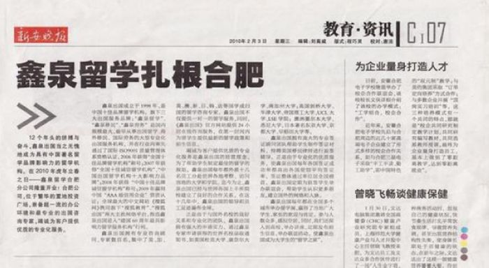 2010年2月4日,是鑫泉留学合肥公司开业大吉之日,新安晚报对此进行了详细的报道: