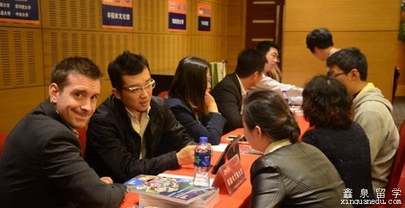在鑫泉留学举办的留学展上,一位招生官正在给学子解读学校招生政策。