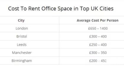 伦敦地区平均每个工位的租金在£650- 1400/月。英国伦敦地区租金最贵,其他地区,例如曼彻斯特,伯明翰等城市工位租金会便宜很多,租金在£200-450镑/月。