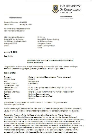 | 录取院校:昆士兰大学 | 录取专业:国际经济学和金融学硕士 |