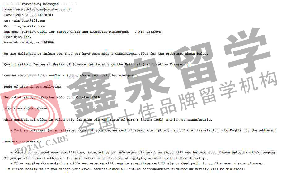| 录取院校:英国华威大学 | 录取专业:供应链管理 |