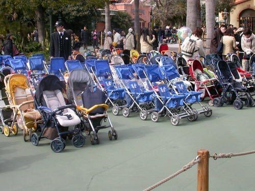 日本节日公园的门外。婴儿车摆放得井井有条 。