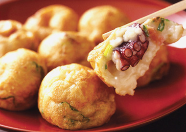 章鱼烧是源自关西的料理,章鱼烧的做法是将面粉加入汤和调味料,然后再将小块的章鱼和碎姜、碎葱等配料掺在一起,最后煎烧成丸状。正宗日本大阪的章鱼烧外脆内滑、金黄娇嫩,一口咬下去百般滋味混在一起,令人赞不绝口。价格也不贵,300块日元六个一盒,便宜的地方300块钱12个一盒。
