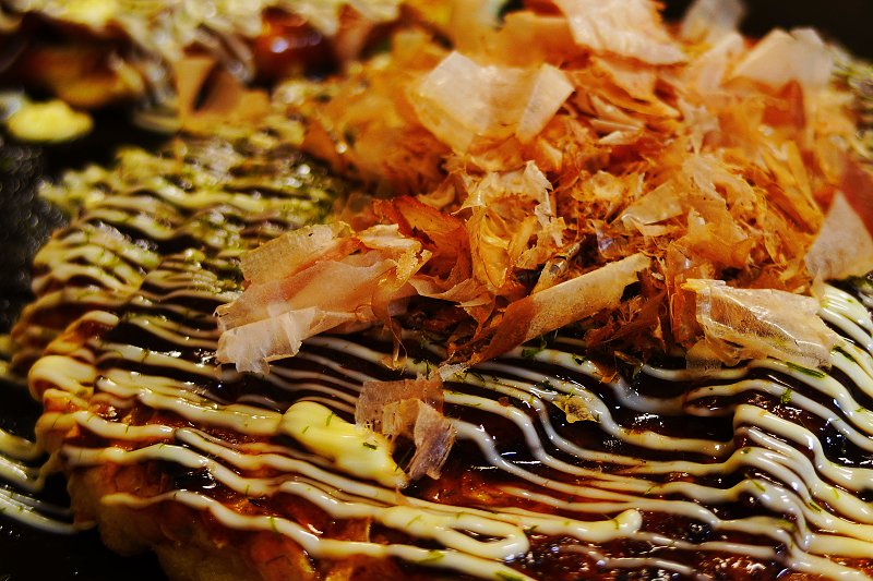日剧里的上班族、年轻学生,都喜欢窝在小小的店里,点一碗上头铺满了高丽菜、葱花、花枝、章鱼、鲜虾、扇贝、高档黑和牛肉片的海陆口味,或明太子、年糕、起司、鸡蛋的独特口味,和碗底的小麦粉汁搅拌均匀,再倒上铁板,用特制锅铲煎成一个圆饼状,最后涂上一层酸甜酱油、日本美乃滋,再洒上海苔粉、柴鱼片,那股夹带着酸味酱油的浓郁香气,正是什锦煎饼独有的味道,也就是关西最典型的家常美食之大阪烧。