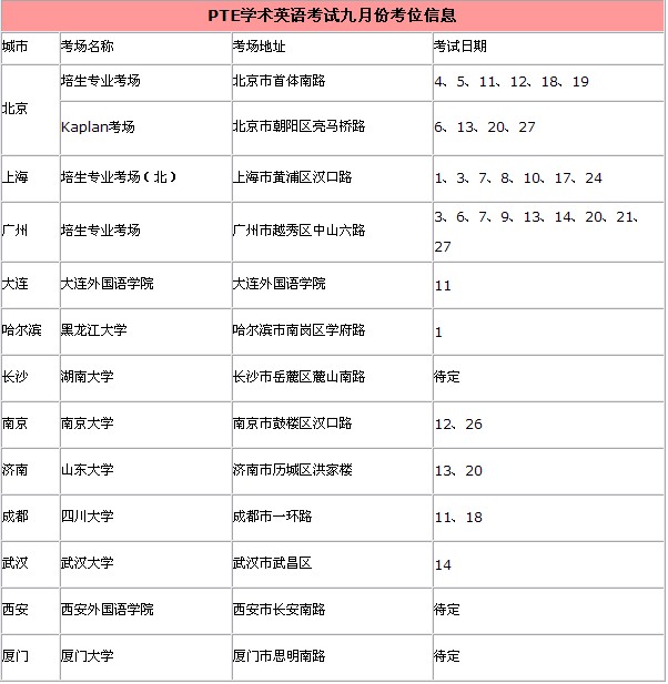 PTE-A在第一季度和第二季度取得了辉煌成就,现在第三季度也已经接近尾声,9月PTE学术考试考位表已出,下面是PTE学术英语考试九月份考位信息表: