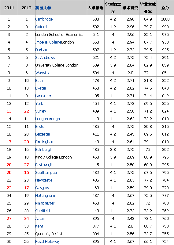 从前十位排名不难看出“姜还是老的辣”。再次验证英国老牌大学的声誉、名望和实力是坚不可摧,不可动摇的。剑桥大学、牛津大学、伦敦政治经济学院稳居各类英国大学排行的前三位。值得注意的是,除了剑桥和牛津换了下位置之外,前十中其他学校的排名几乎和Times“如出一辙”。不禁让人猜想2014年的Times排名前十是否会毫无变化?