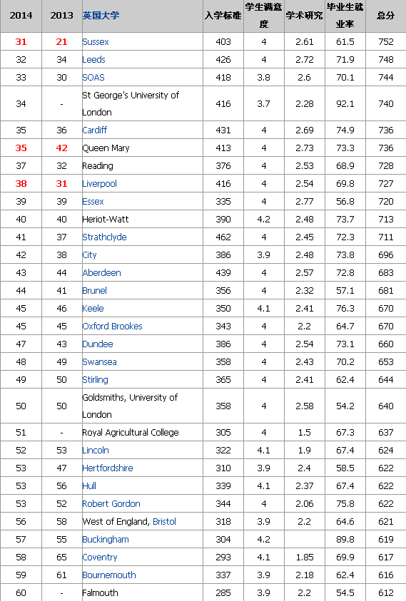 每年大学排名都是这样,有表现“给力”的,当然也有表现“不尽如意”的。例如一直表现出色的英国名校苏塞克斯大学,其排名从2013年的22名一下跌出Top30之列(2014年排名31)。