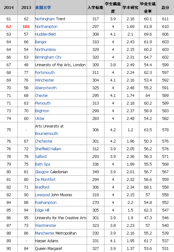 在此排名中,北安普顿大学的表现特别“给力”,一年中从第101名提升到第62名。这所在2013年Times排名中排在第99名的大学并不为中国童鞋熟知,和2013年Times排名18的南安普顿大学相比,更是相距甚远。这和其英国“新兴”学校之名多少脱不了关系。