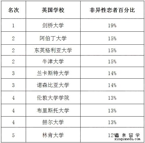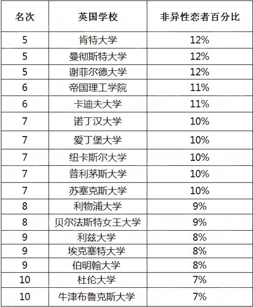 学费低廉、环境优美、学习氛围浓厚的英国林肯大学'>林肯大学(University of Lincoln)与肯特大学(University of Kent)、曼彻斯特大学The University of Manchester、谢菲尔德大学(The University of Sheffield)非异性恋者百分比都是12%,排在第五名!