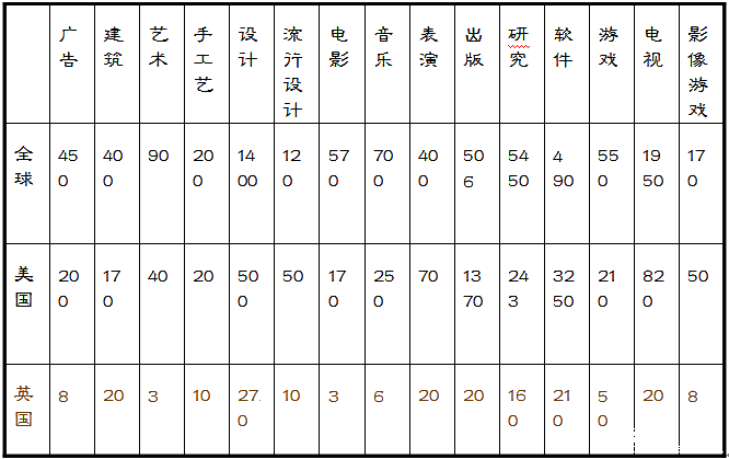 目前英国的创意产业为英国GDP的贡献率已达8%,全国创意产业相关从业人员超过200万人,在伦敦就集中了50万创业相关产业链的从业人员。在过去8年,英国创意产业平均年增长率达到6%,比英国整体经济增长速度高出一倍多(单位/亿美元)